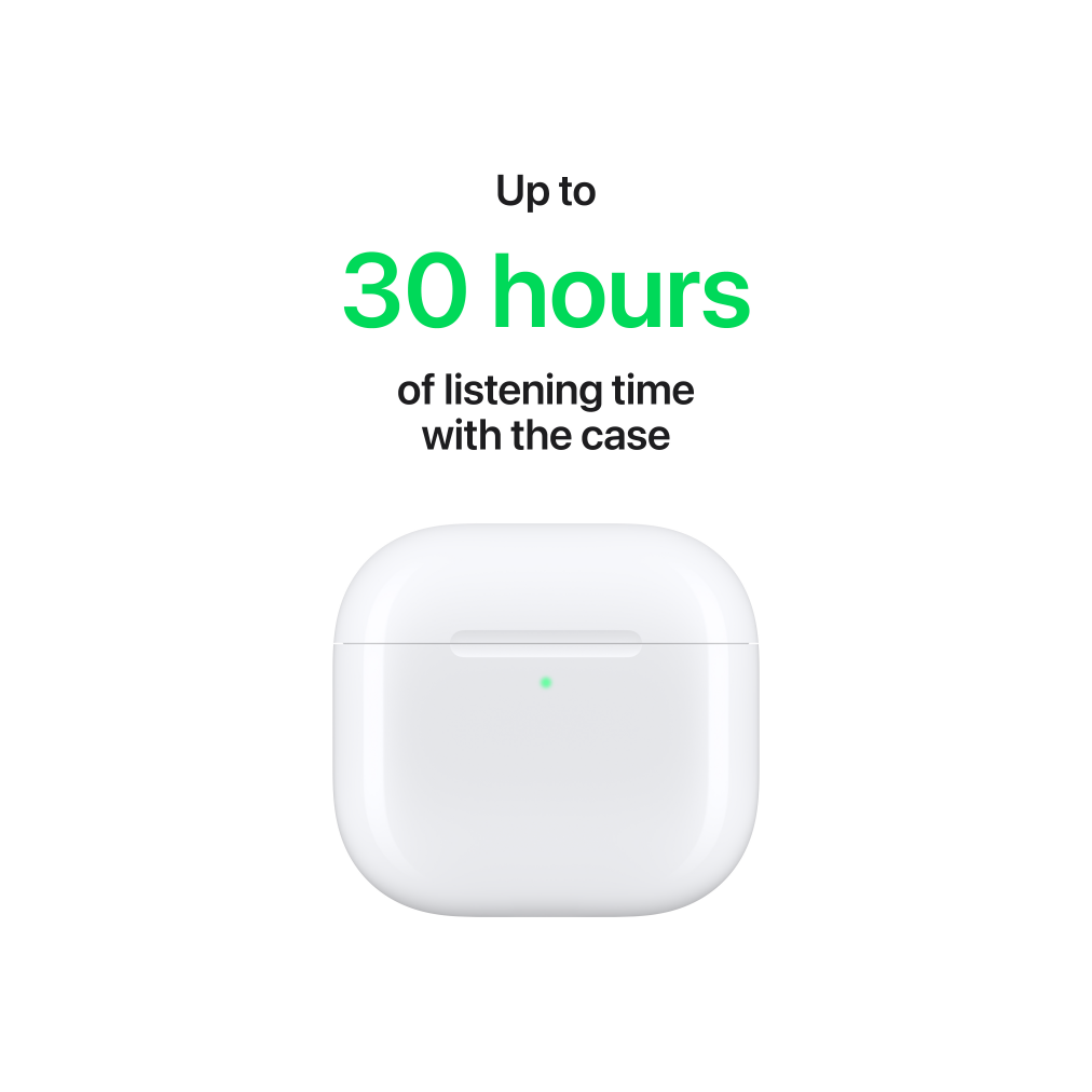 9. Testing conducted by Apple in July and August 2024 using preproduction AirPods 4 (Active Noise Cancellation) with Wireless Charging Case paired with preproduction iPhone 16 Pro Max units, all with prerelease software. The playlist consisted of 358 unique audio tracks purchased from the iTunes Store (256-Kbps AAC encoding). Volume was set to 50%; Spatial Audio, Conversation Awareness, and Noise Control were all off. With Noise Control set to Active Noise Cancellation, listening time was up to 4 hours. Testing consisted of full AirPods battery discharge while playing audio until the first AirPod stopped playback. Battery life depends on device settings, environment, usage, and many other factors.