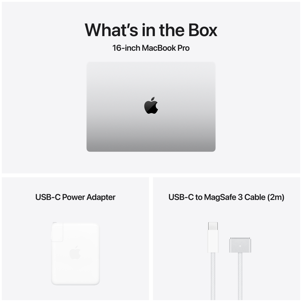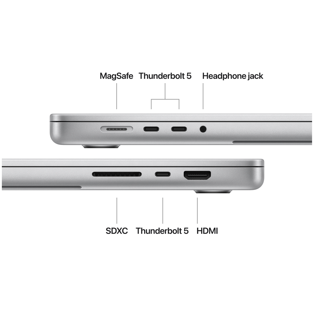 • CONNECT IT ALL — The 16-inch MacBook Pro features three Thunderbolt 5 ports, a MagSafe 3 charging port, SDXC card slot, HDMI port, and headphone jack. And it supports up to two external displays with M4 Pro, or up to four with M4 Max.