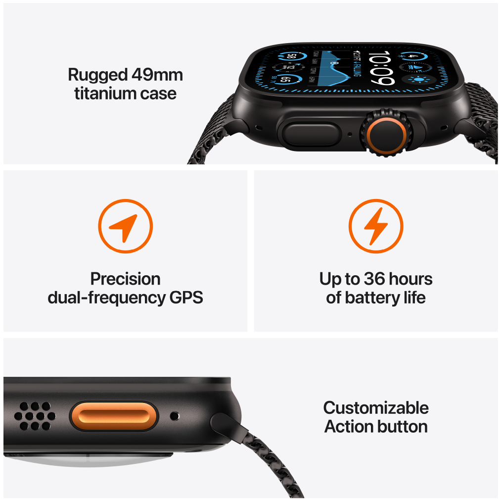 • WHY APPLE WATCH ULTRA 2 — Meet the ultimate sports and adventure watch. Advanced features for runners, cyclists, swimmers, hikers, divers, and more. Rugged titanium case, now available in satin black. Superbright Always-On Retina display. Incredibly accurate precision dual-frequency GPS. Powerful
